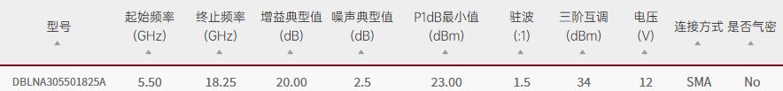 详细资料:, Qotana DBLNA305501825A 宽带低噪声放大器2GHz-18.25GHz 特点:
